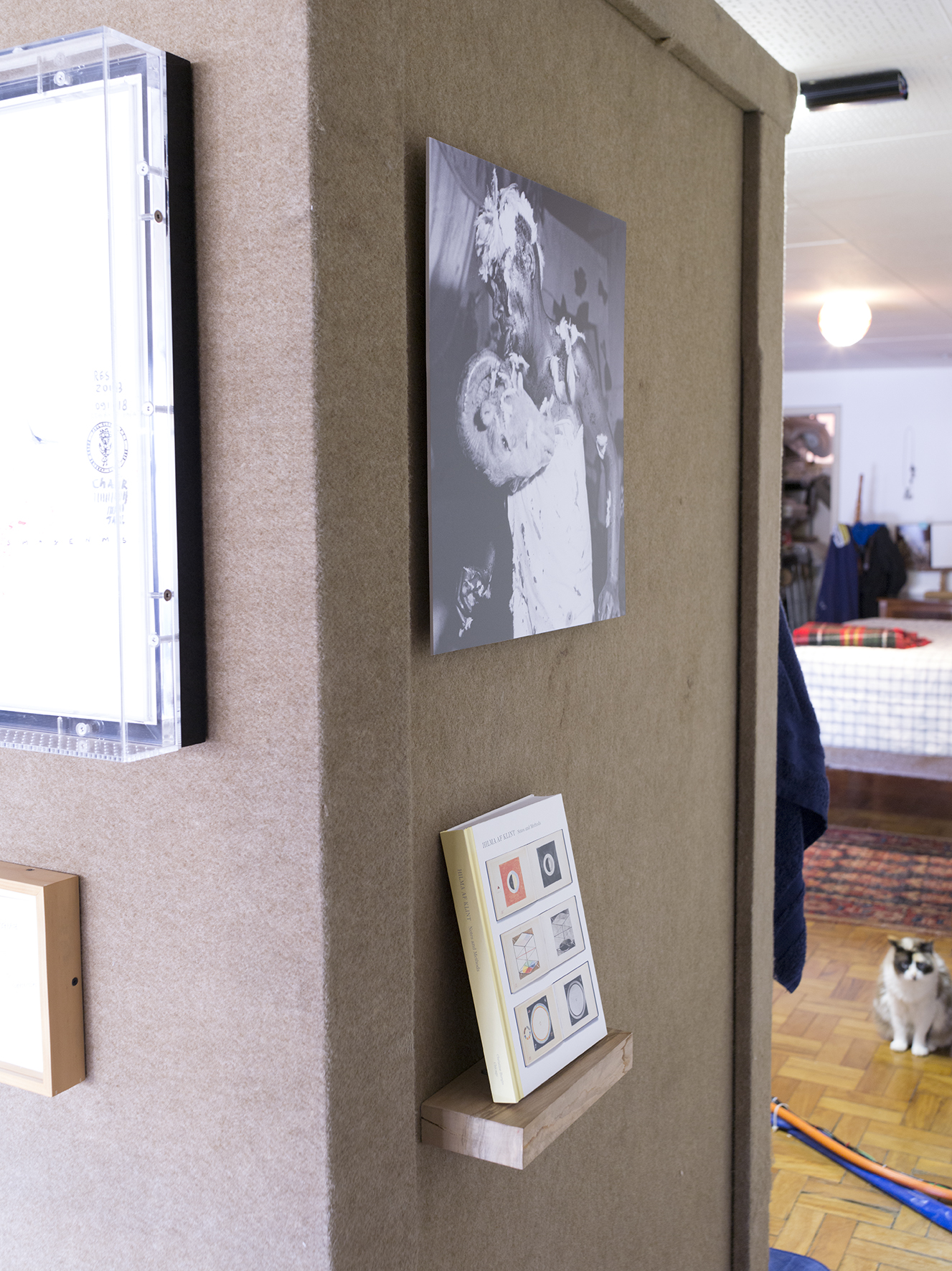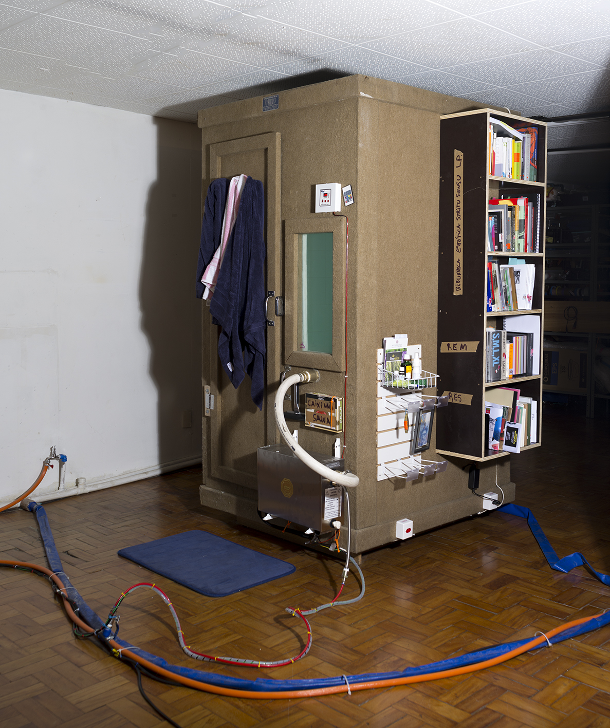 Materiais: cabine audiométrica, sauna a vapor, mangueiras, fiação elétrica, Toalhas, azulejo, banco de pedra, óleos essenciais, loja, prateleiras para até 200 livros, iluminação Led colorida, equipamentos acústicos - doados por Anna Israel, quadro de patronos do Museu, “caixinha” da sauna. espaço expositivo